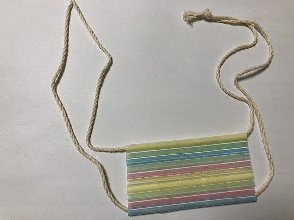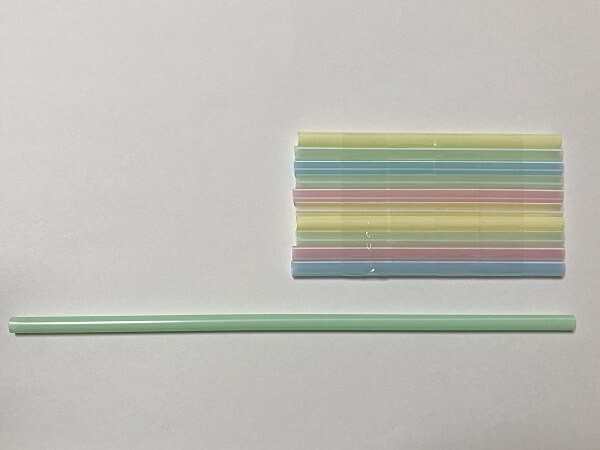 切り口で手を怪我しないように注意しましょう。 切ったストローを横に並べ、左右1センチほど内側をセロハンテープで2か所貼り合わせます。![]()