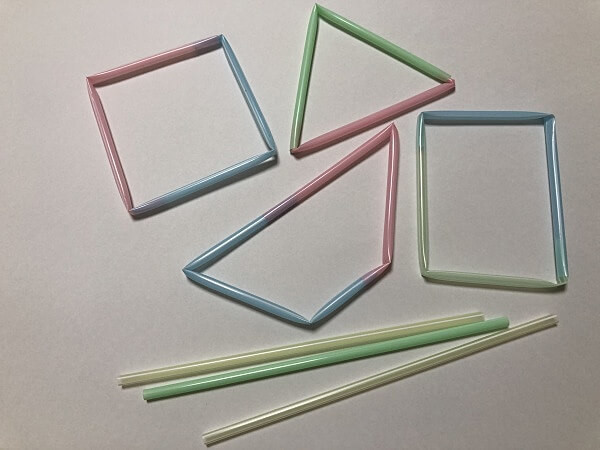 1本のストローの端を少し折りたたみ、もう1本のストローの端に差し込んで、ストローを好きなところで折りながら、三角形や四角形などの形にします。反対側の端も、同様につなぎ、ストローアートを作ります。 事前に形を想像しながらストローを切り取ってもよいでしょう。