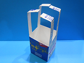 (1)の牛乳パックの折った所の上に、(2)のお菓子の箱をボンドなどでくっつけて完成。