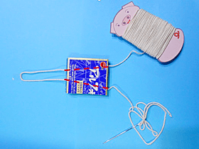 お菓子の空き箱を、牛乳パックの底よりも大きめのサイズに切ります。 側面の4か所にキリなどで穴を開け、たこ糸を写真のように通します。穴を開けるポイントは、片方の間隔を狭くし、もう一方の間隔は広くすることです。 また、たこ糸が通しづらい場合は、ピンなどの先に糸を結んで針にしたり、セロハンテープなどでたこ糸の先を巻くと通しやすくなります。