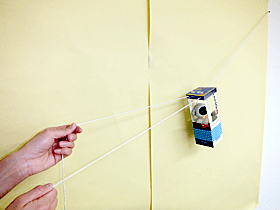 2本のたこ糸を交互にひっぱると、ロープウェイが移動します。 「何を乗せて遊ぼうかな?」