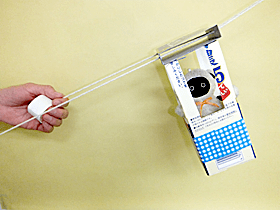 ・ロープウェイには重いものをのせないようにしましょう。 ・たこ糸が首にからまないよう注意しましょう。 ・牛乳パックやお菓子の箱は硬いので、保護者が切るようにしましょう。