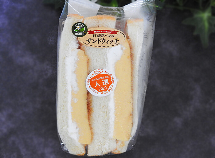 外包を外さずとも伝わってくる分厚いプリンのずっしり感がすごいマミーマート「自家製プリンのふんわりホイップサンド」。2020年の「お弁当・お惣菜大賞」パン部門で入選しているサンドイッチですよ。
