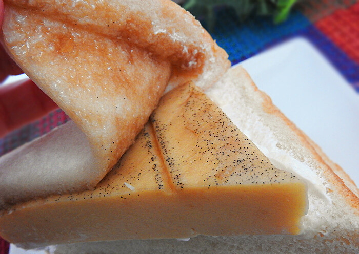 サンドイッチの中に入っているプリンはわりとたまごが強めに出ていたと思います。過度な甘ったるさはなく、優しい味わい。1切れ分食べれば、十分満足できるほどのボリューム感に圧倒されました。