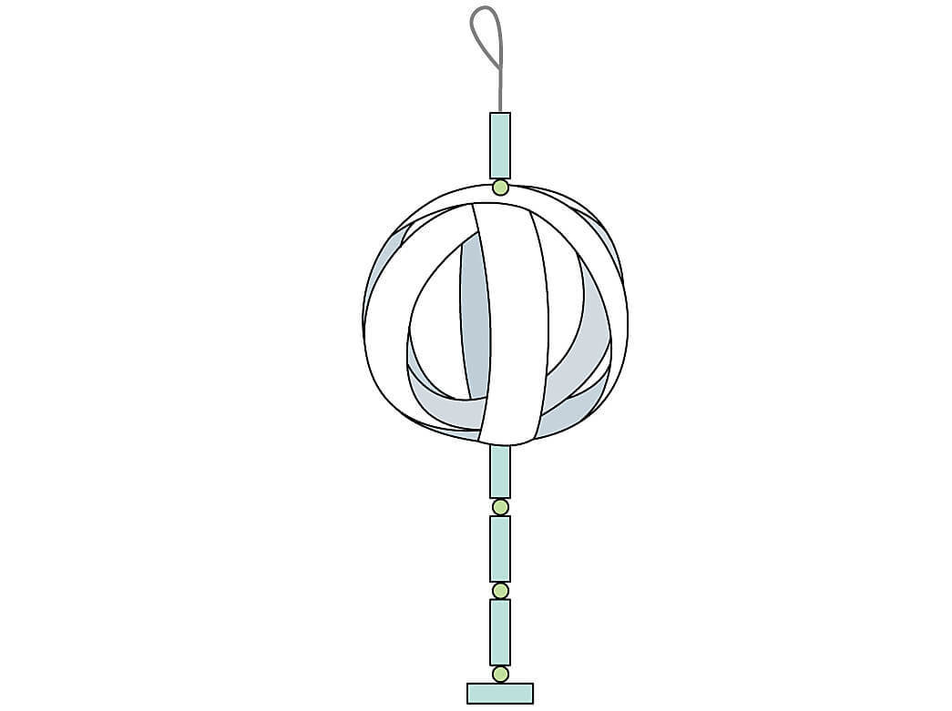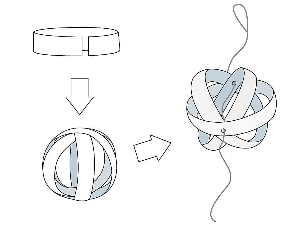 (1)を1つずつ輪にして3つを組み合わせ、球体にします。このとき輪が剥がれないようにセロハンテープなどで止めます。