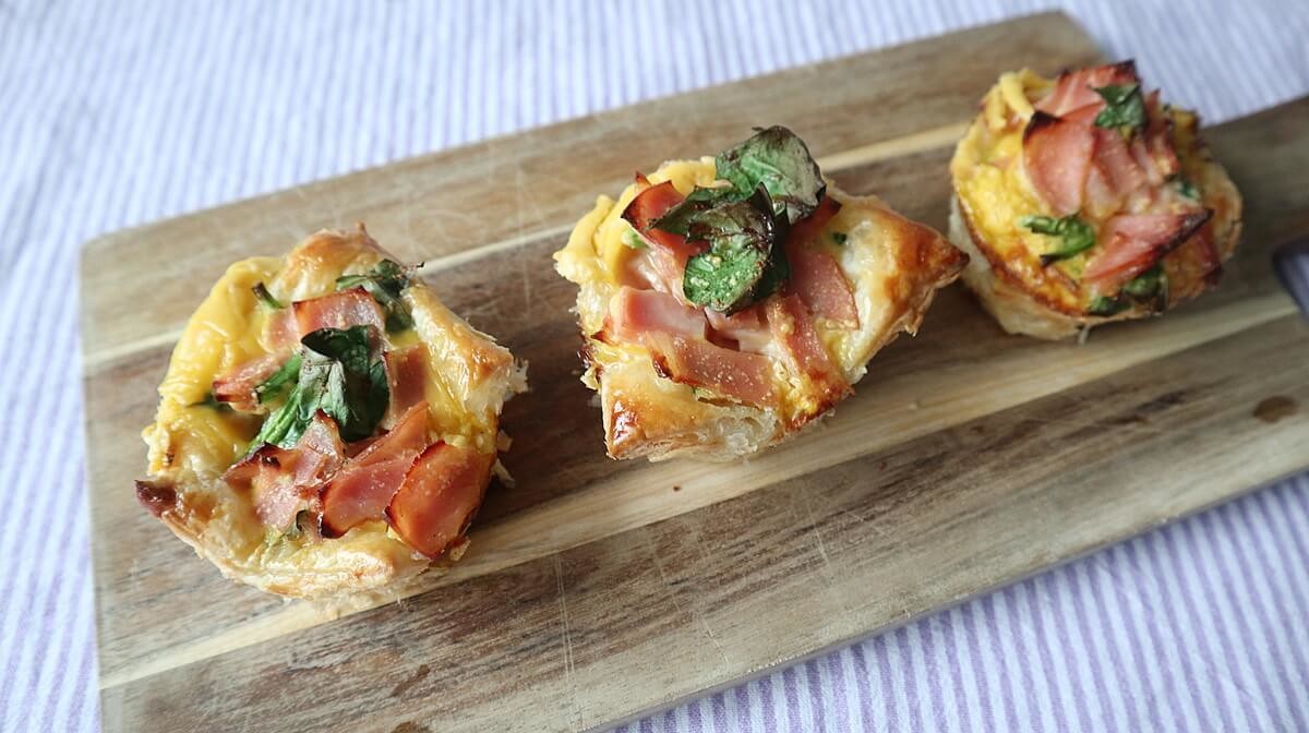 マフィン型にシートをしいて、卵液を注いでオーブンで焼いたらキッシュが完成。