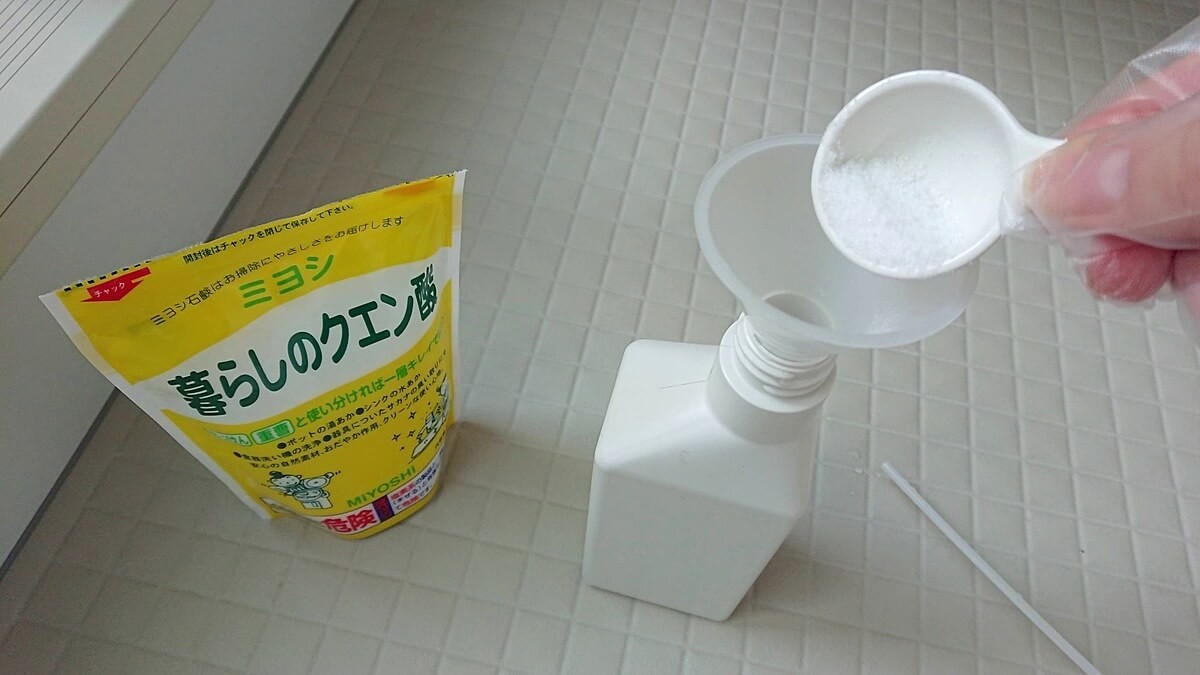スプレーボトルにクエン酸と水を入れ、ボトルをよく振って溶かします。