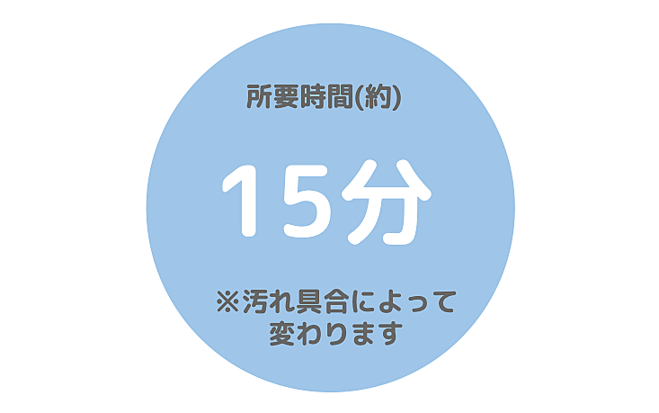 所要時間に、洗剤の作成時間や置き時間は含みません。また汚れ具合やおうちの環境によって所要時間は変わりますので、目安にしてください。