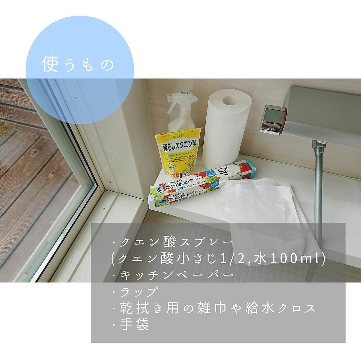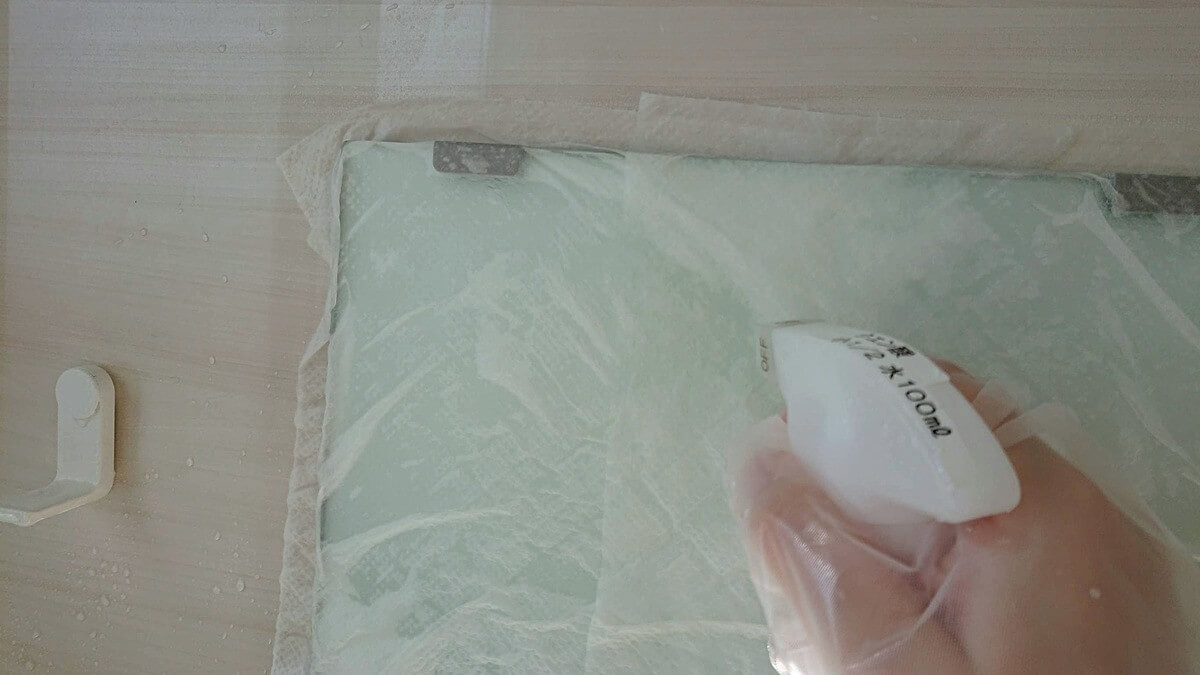 (2)キッチンペーパーにクエン酸スプレーを拭き貼り付ける