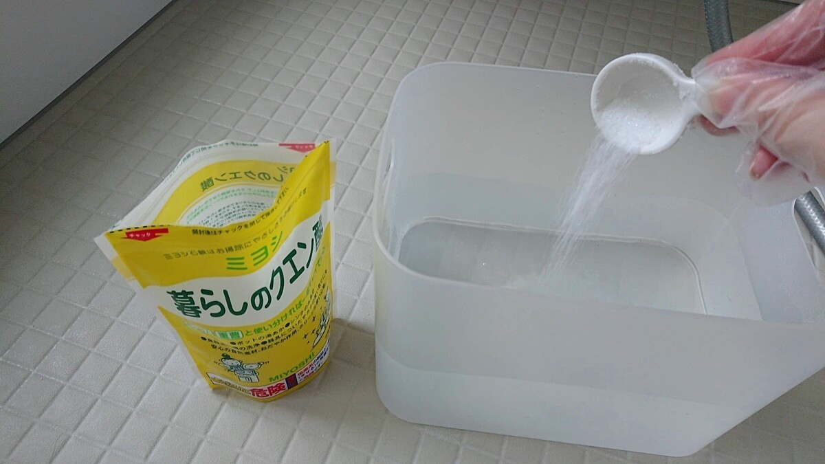洗面器に水をため、クエン酸(大さじ2~3)を溶かします。