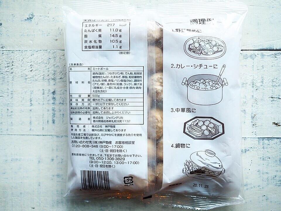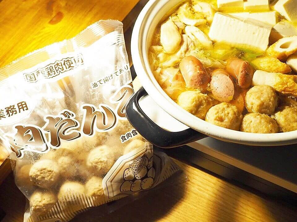 国産鶏肉使用の、油で揚げてある状態の肉だんごが、冷凍されてたっぷり入っています。