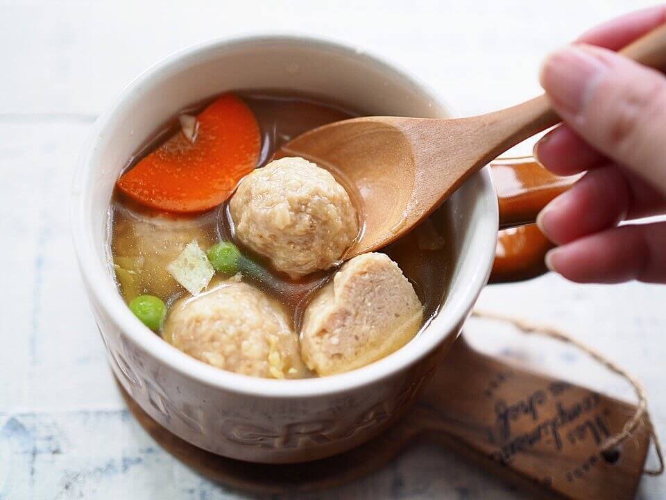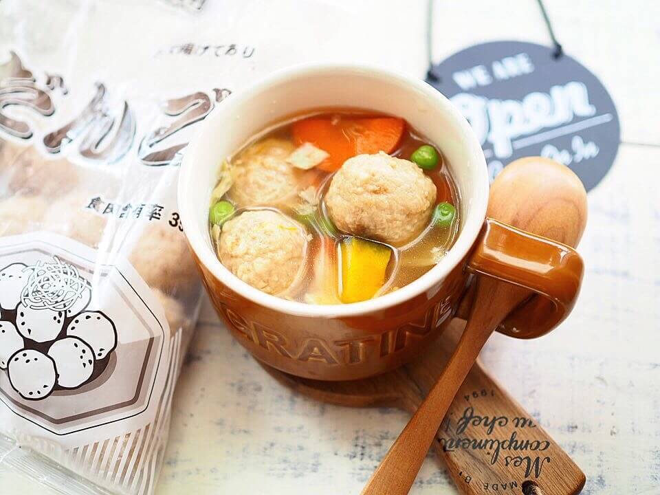 お鍋に冷蔵庫の余り野菜をカットして入れて、コンソメで味をつけた野菜スープに肉だんごを入れれば、簡単にポトフが完成♪