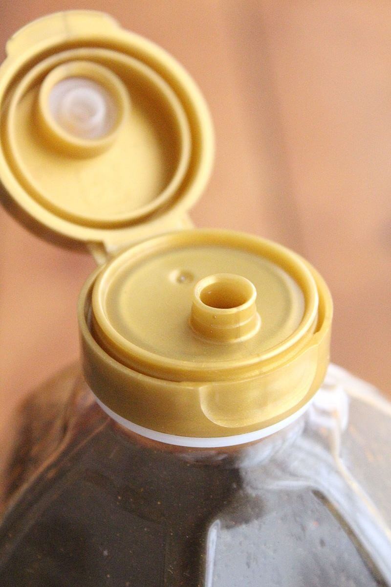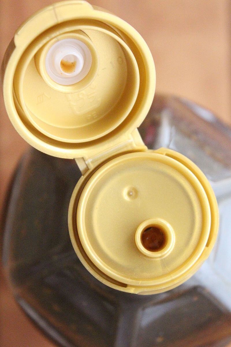くびれているので1㎏サイズでも子どももラクラク持てるし、液だれしにくい形状のキャップです。