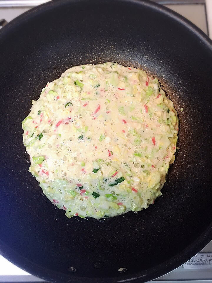 2、熱したフライパンに大さじ1の油を敷いて、1の生地を流し入れます。