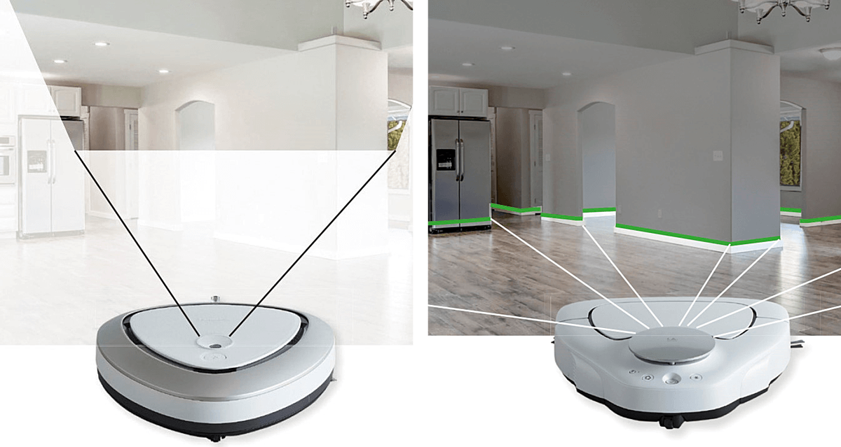 下図のように、従来の「ルーロ」は、視界が上のほうに限られていました。新しい「ルーロ」は、360°全方位を見渡せるんです。レーザーセンサーを使った「レーザーSLAM」によって、1秒間に10回転の高速回転で周辺環境を見極め、部屋の間取りや障害物を把握しています。