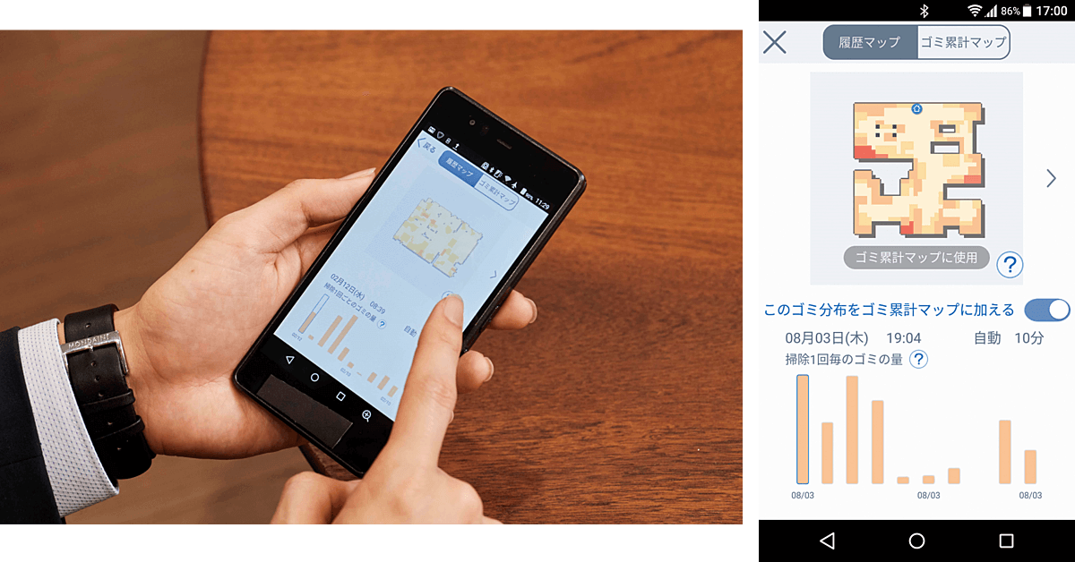 浦川さん:スマートフォンのアプリで操作が簡単にできますよ。専用アプリ「RULOナビ」では、「ゴミマップ」で掃除結果が一目で分かります。ゴミの量、掃除時間に加え、ゴミの多い場所は濃い色で表示されます。