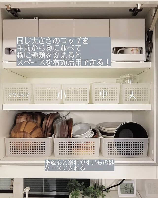 同じ大きさのコップをケースの手前から奥に並べて、横に大・中・小と種類を変えるとスペースを有効活用できます!