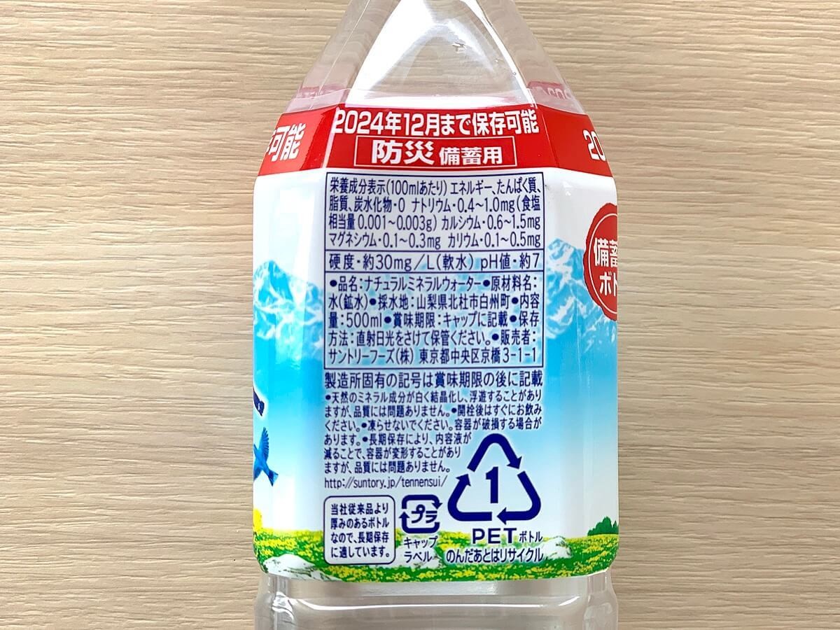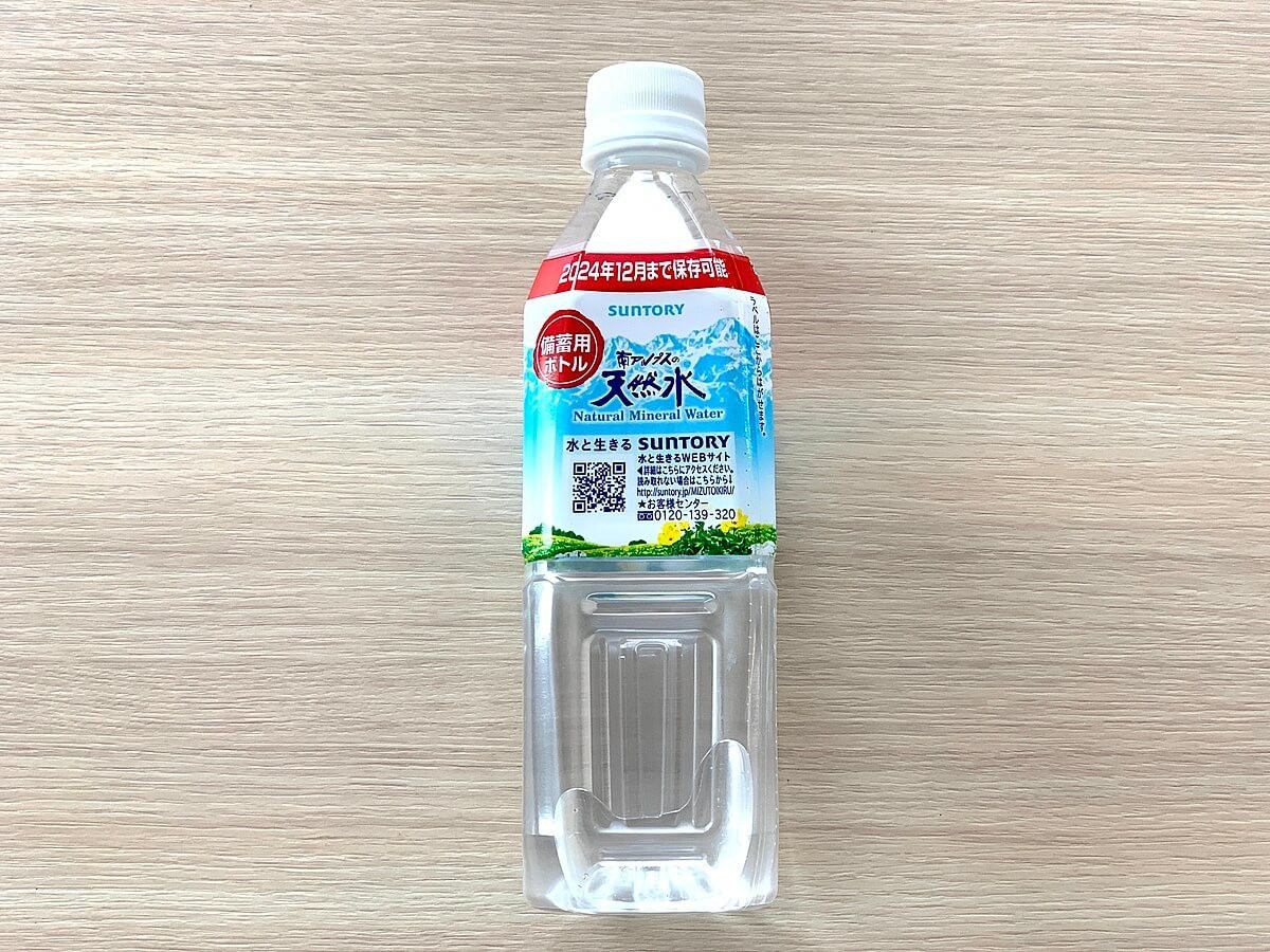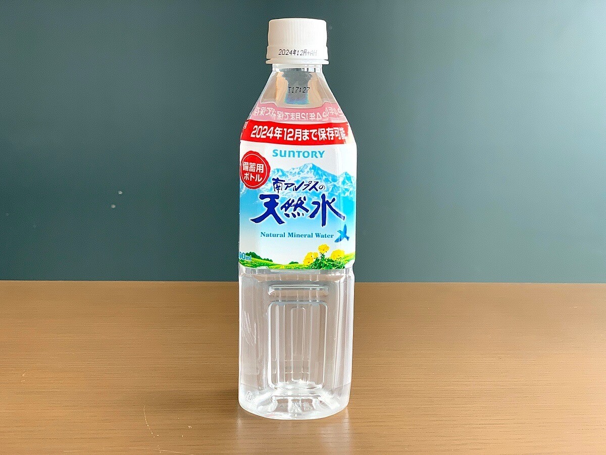 こちらは、「2024年12月まで保存可能」とわかりやすく表示された水。先ほどと同じ、南アルプスの天然水です。