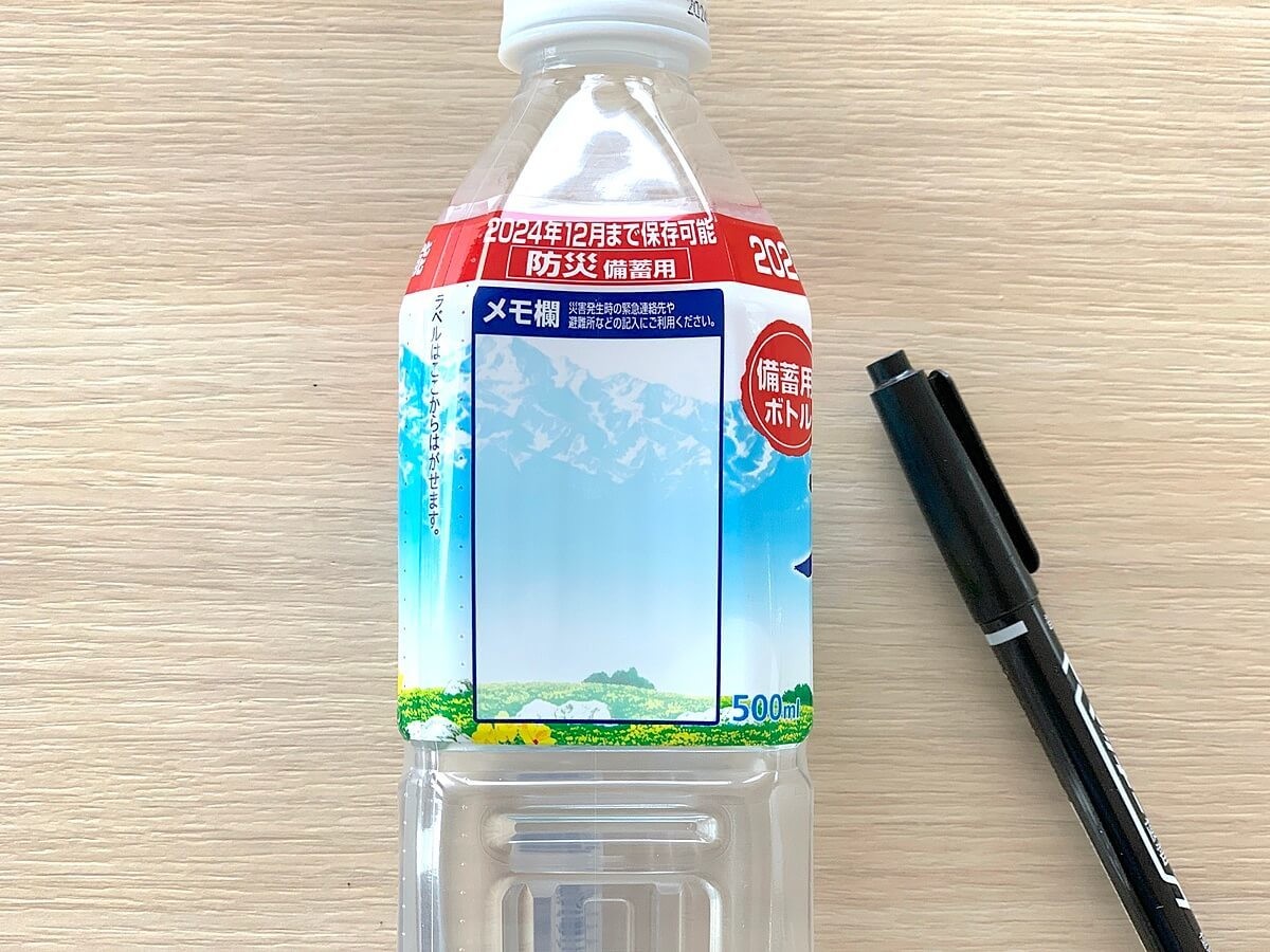 防災備蓄用のペットボトル側面には「メモ欄」がありました。