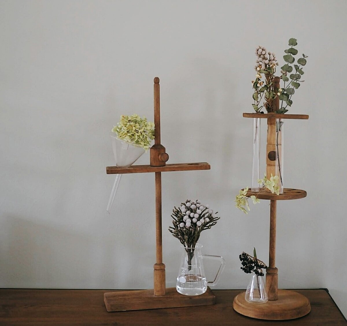 こちらは古道具屋さんで購入した古い実験道具です。本来の用途とは異なりますが、私はときどきフラワーベースとして使っています。