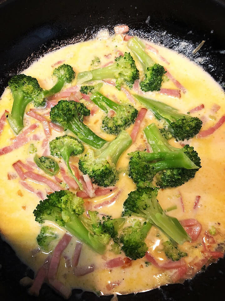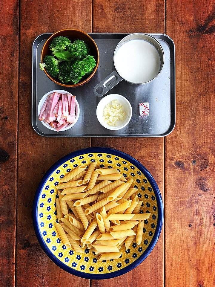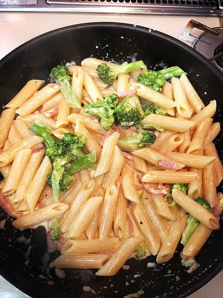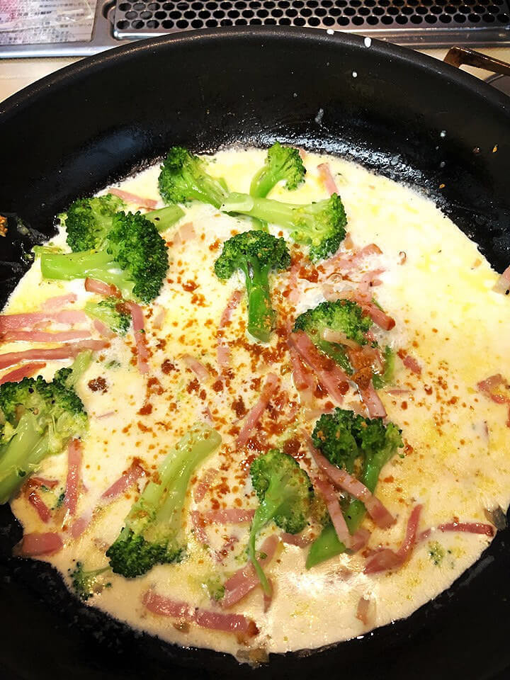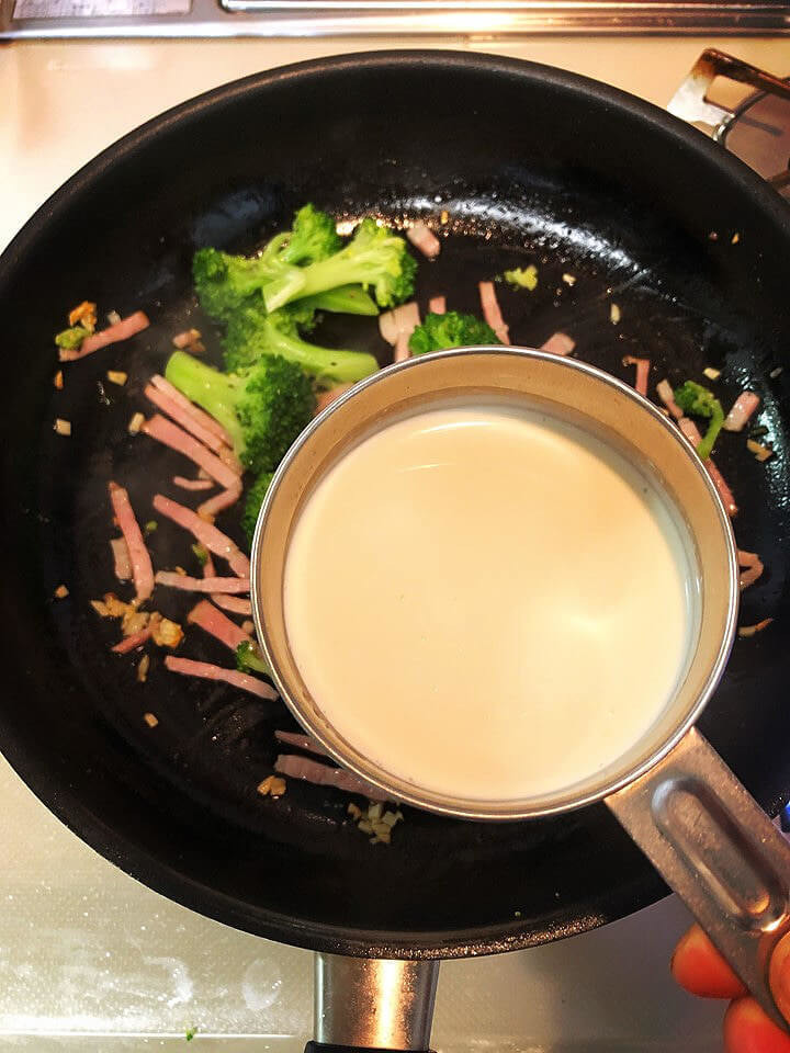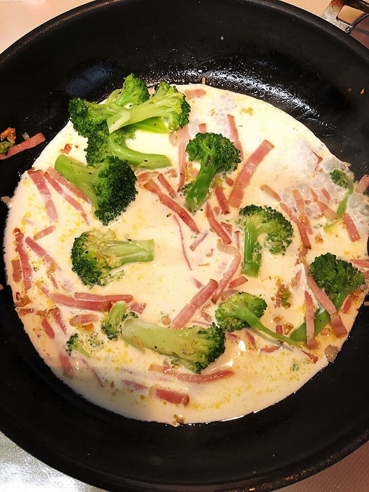 2人分 ◯パスタ…160g ◯にんにく…1かけ(みじん切りにする) ◯ベーコン…40g ◯茹でブロッコリー…80g ◯生クリーム…150cc ◯コンソメキューブ…2分の1個