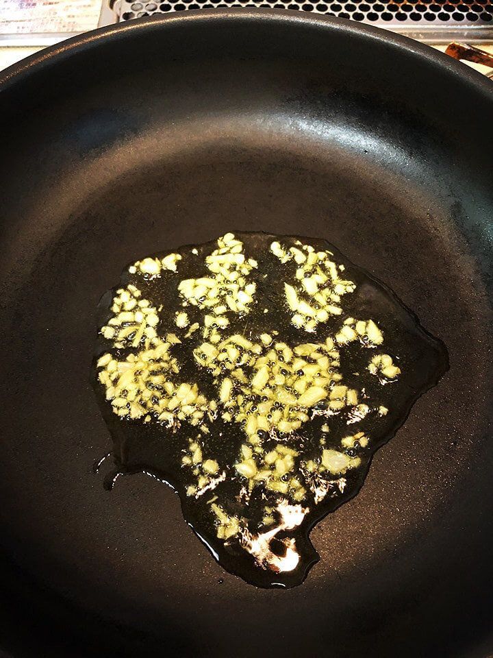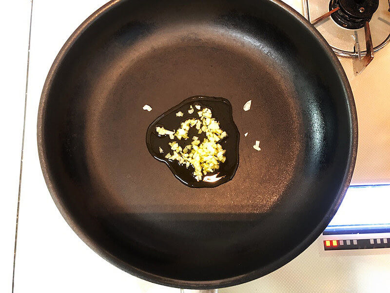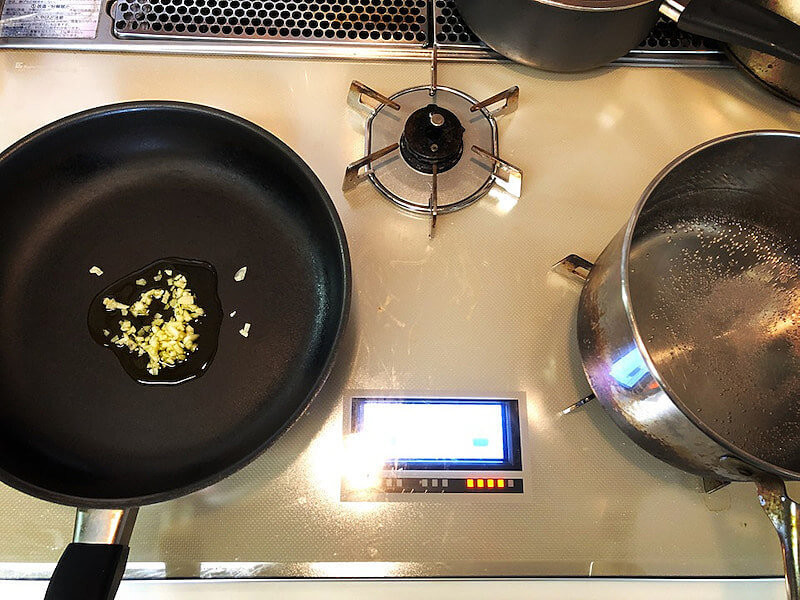 (1)パスタ用のお鍋を火にかけ(1%の塩を入れる)、フライパンにオリーブオイル大さじ1(材料外)と にんにくを入れ、弱火でじっくりと香りを出します。