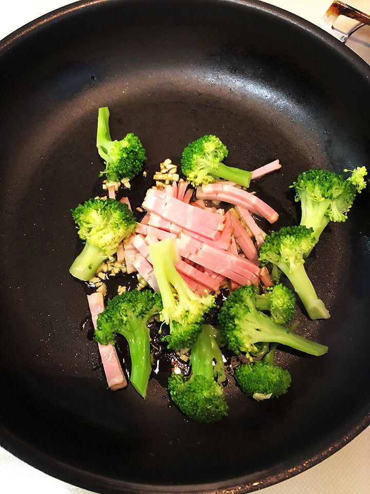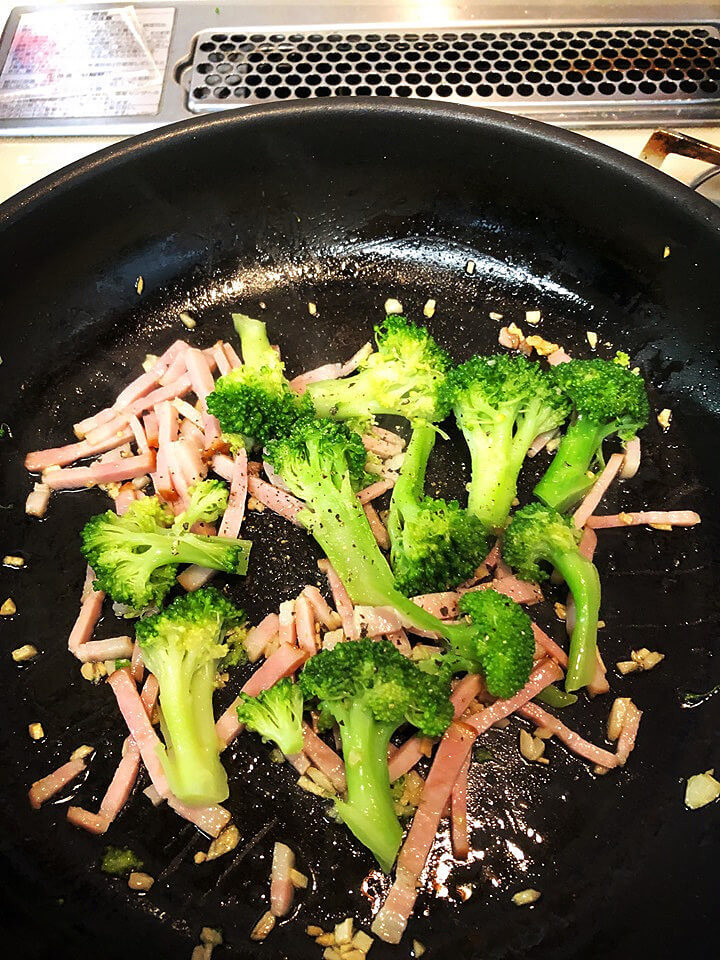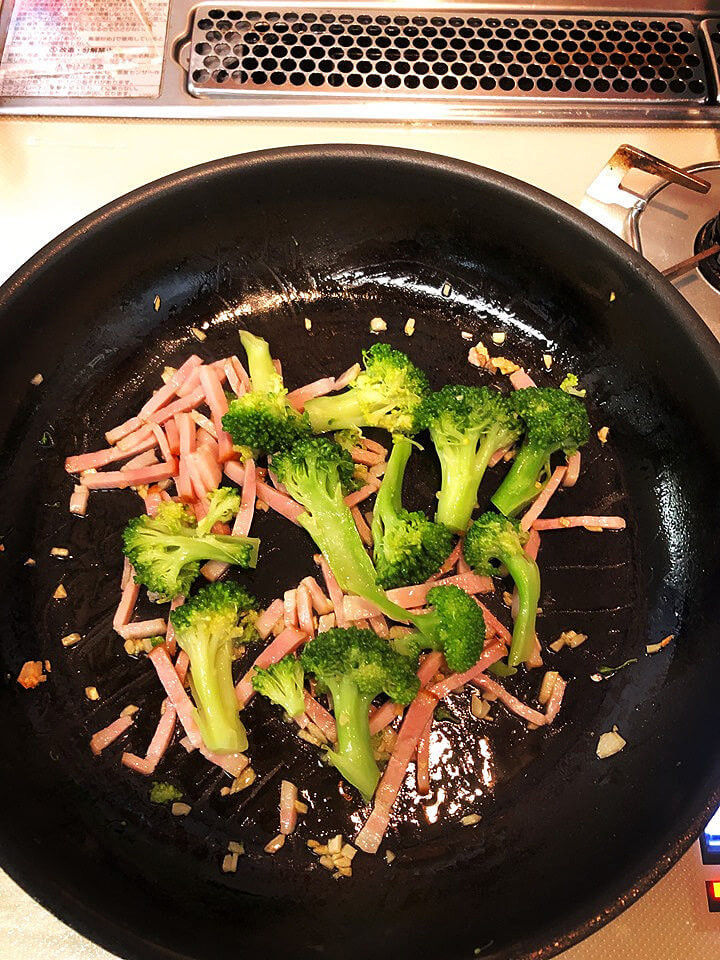 (2)(1)のにんにくを弱火で2分ほど加熱したら、細切りにしたベーコンとブロッコリーを加えて炒めます。