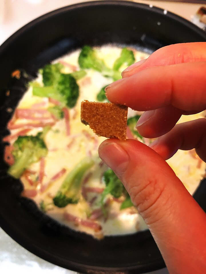 (3)生クリームを加え、コンソメキューブを崩しながら入れます。