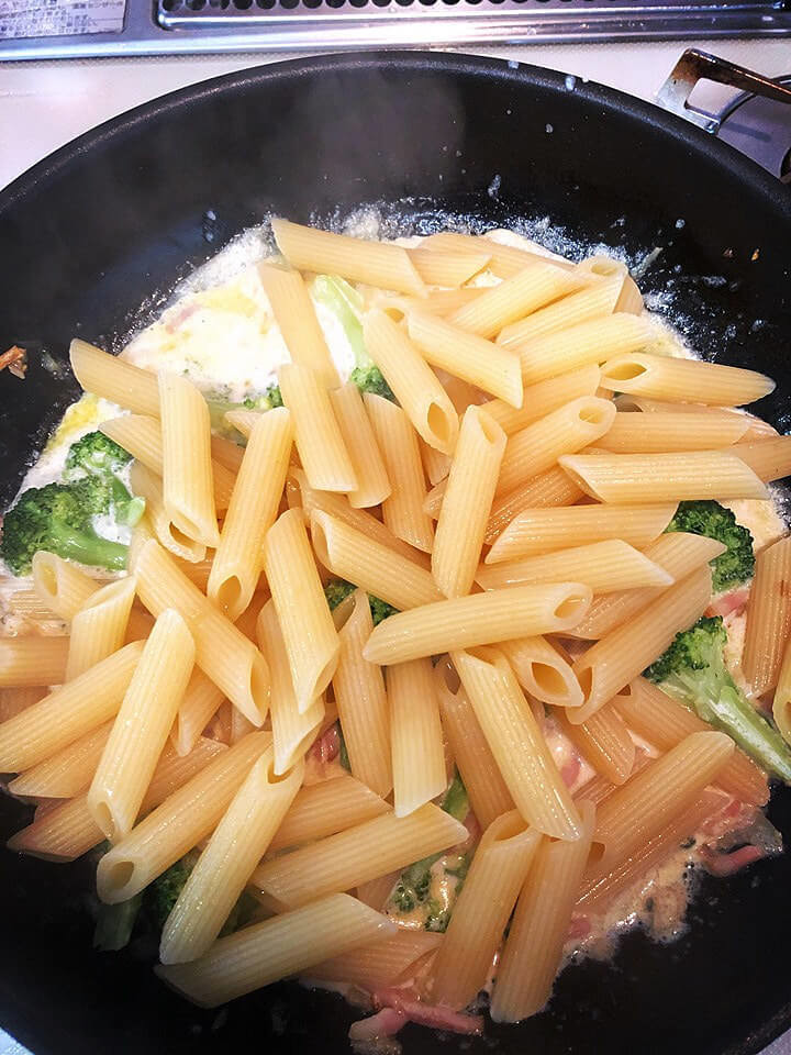 (4)ゆで上げたパスタをソースに入れて和えます。