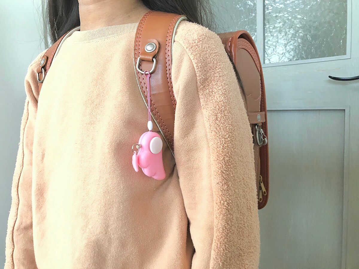 ランドセルの肩ベルトのフックに取付け、いざという時に子どもが簡単に引っぱれることも確認しました。