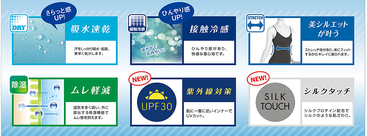 高温多湿の日本でも快適にファッションを楽しめる肌着を目指し開発されたファイバードライから、着ていることで素肌の30倍日焼けをしにくい「UPF30」と、シルクプロテインを配合し、まるでシルクのようなツルツルすべすべな肌触りを実現させた「シルクタッチ」の2つの機能を新たに搭載した新商品が登場します。