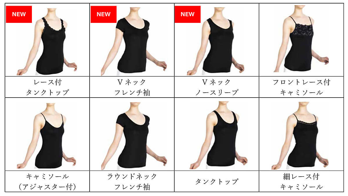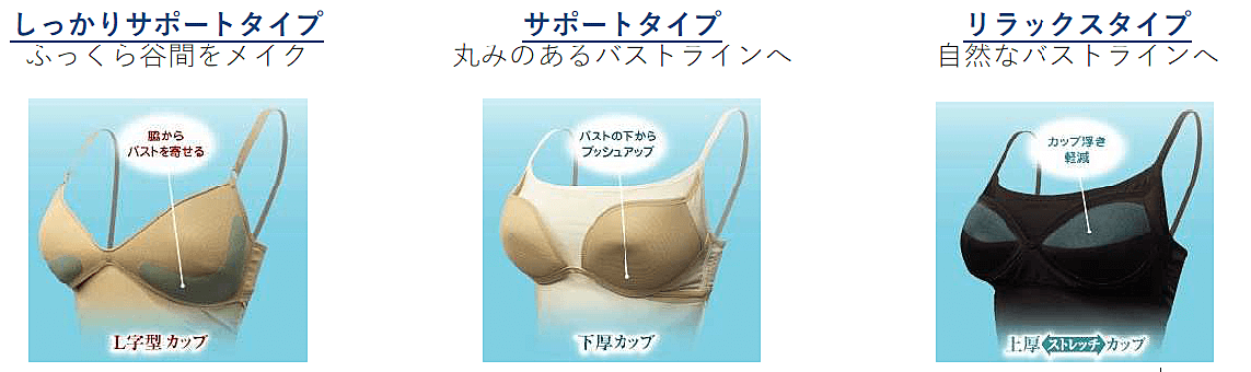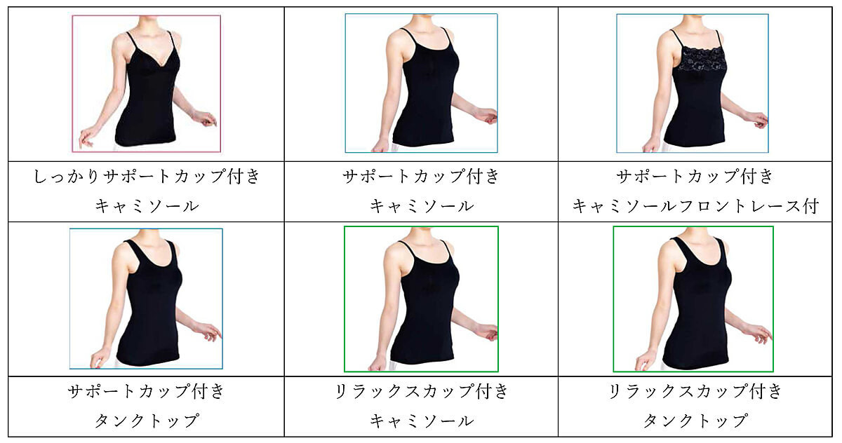 キャミソールタイプは全3種類のカップデザイン、タンクトップタイプにはサポートタイプとリラックスタイプの2種類のカップデザインをラインナップしています。