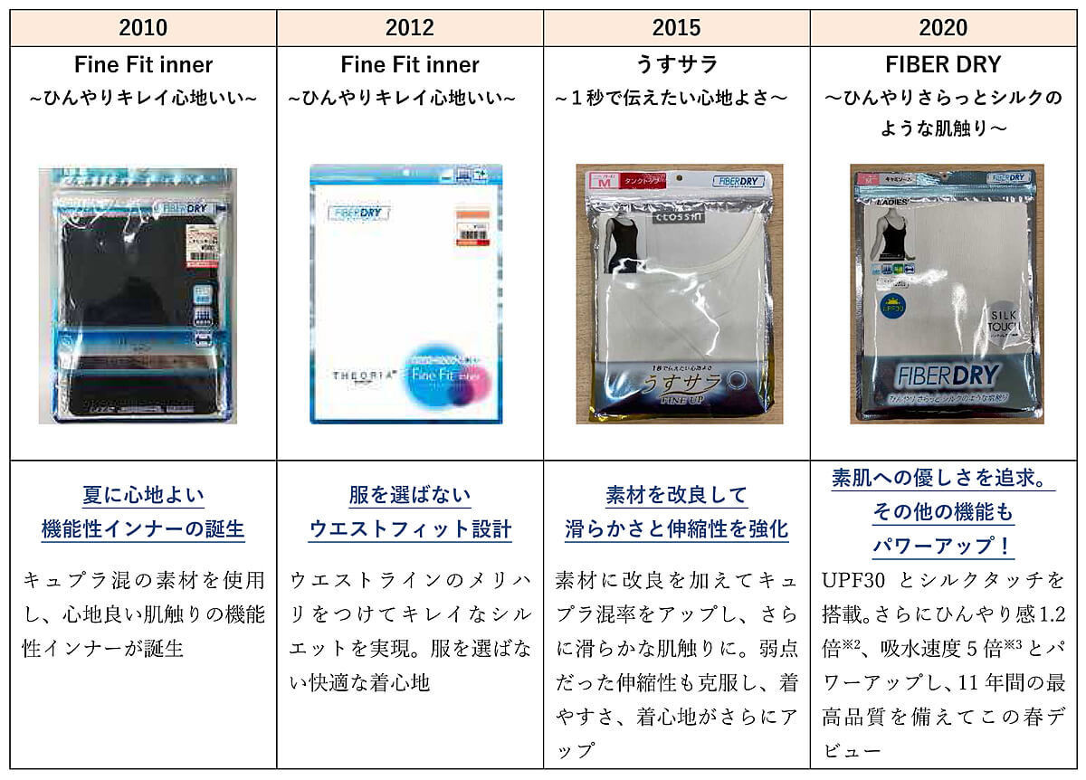 レナウンインクスが生産する機能性インナー「ファイバードライ」は、高温多湿の日本の夏の気候の中でファッションを快適に楽しむための肌着を目指して、しまむらと共同開発を行い2010年に発売開始しました。