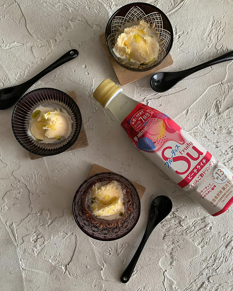 @panta_rhei.hさんは、いつものバニラアイスを“味変”して、トッピングとして「フルーティス™」を使ってみました。選んだフレーバーは「ピーチライチ」。