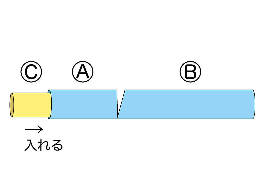 2のストロー(C)を細く巻き、1で切ったストローの短い方(A)に入れます。