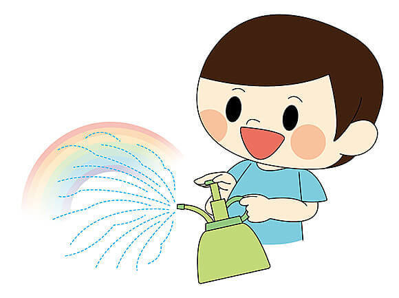 霧吹きに水をいれ、太陽に背中を向けて、霧吹きします。細かい水の粒をたくさん出すと、虹ができます。