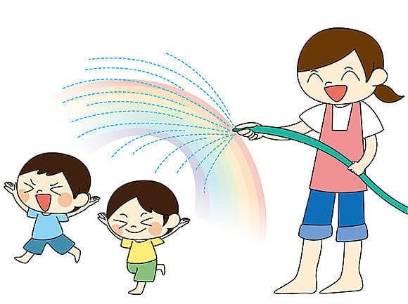- 水が苦手な子どもにも、霧の中に見える虹を楽しめたり、涼しさを感じられるように十分配慮しましょう。