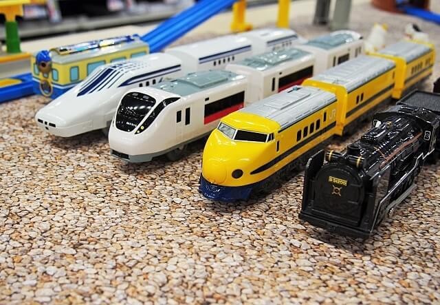 足の踏み場もなくなるので、忙しい平日は遠慮してもらっているプラレールも、休みの日は思う存分、長~いレールを作ってもOKに。