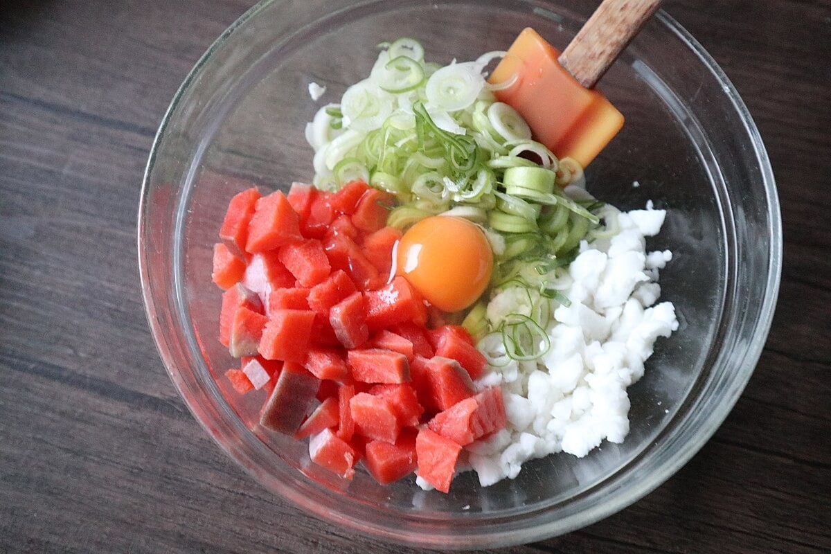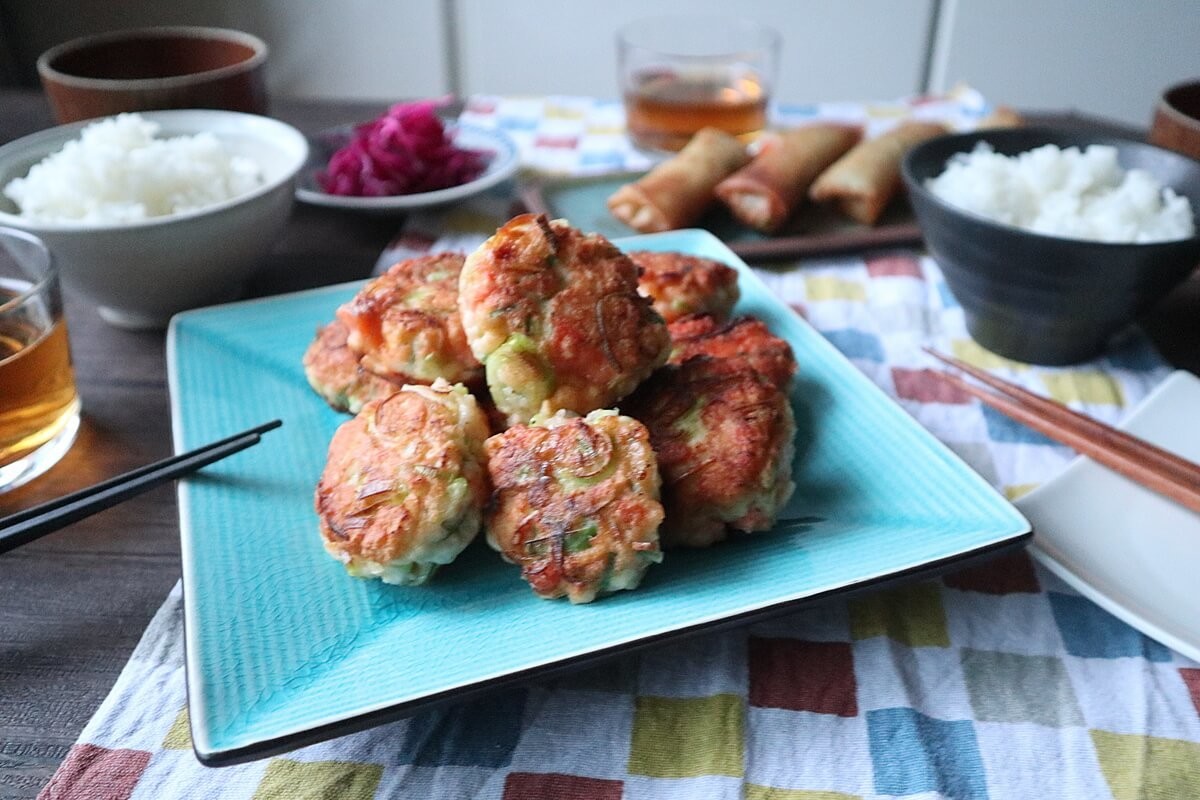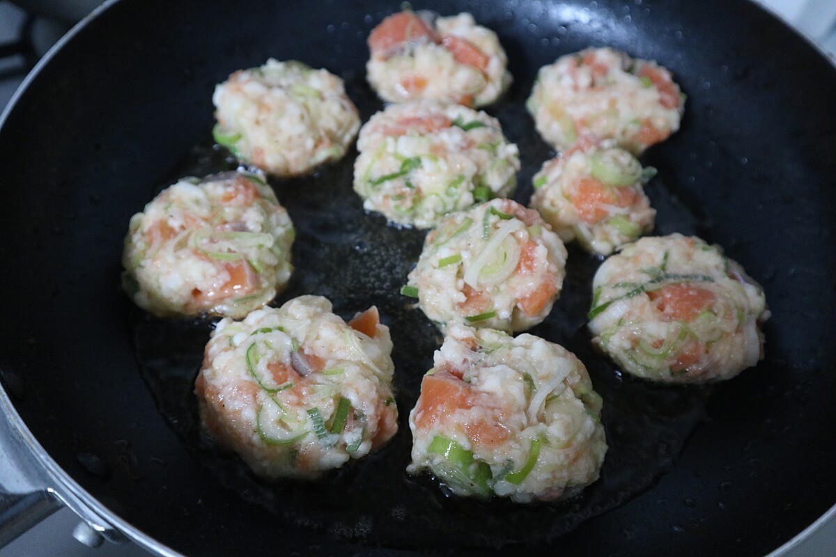 1.鮭は骨と皮を取り除いて、粗みじん切りにする。長ねぎは小口切りにする。 2. ボウルに、はんぺんを入れて泡だて器でつぶし、鮭、長ねぎ、卵、片栗粉、塩、こしょうを加えて、つぶしながらよく混ぜる。10等分にする。