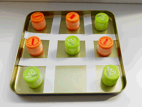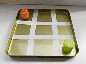 空き缶の蓋、あるいは空き箱の蓋を裏返し、写真のように、1マス4〜5センチ以上の四角で、箱のサイズに合わせて、3等分になるようにビニールテープを貼り盤にします。縦と横を同じマス目になるようにしましょう。箱が大きい場合は、4等分以上できますが、あまり多いと難しくなるので、3等分くらいにおさめましょう。 箱の片方は後ほど使うので、置いておきましょう