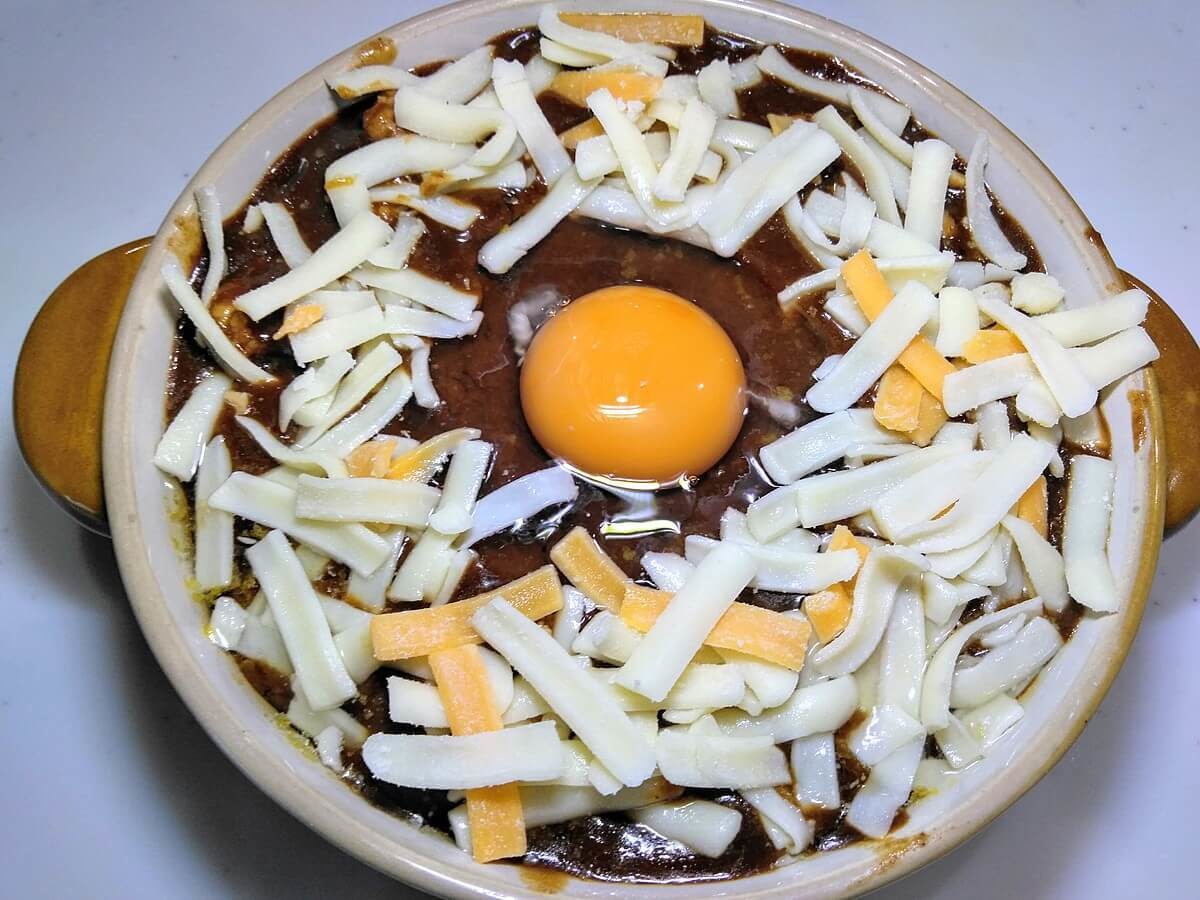 耐熱容器にごはんを敷き詰め、冷たいままのカレー、生卵、ピザ用チーズをのせてからオーブントースターで焼くだけ!