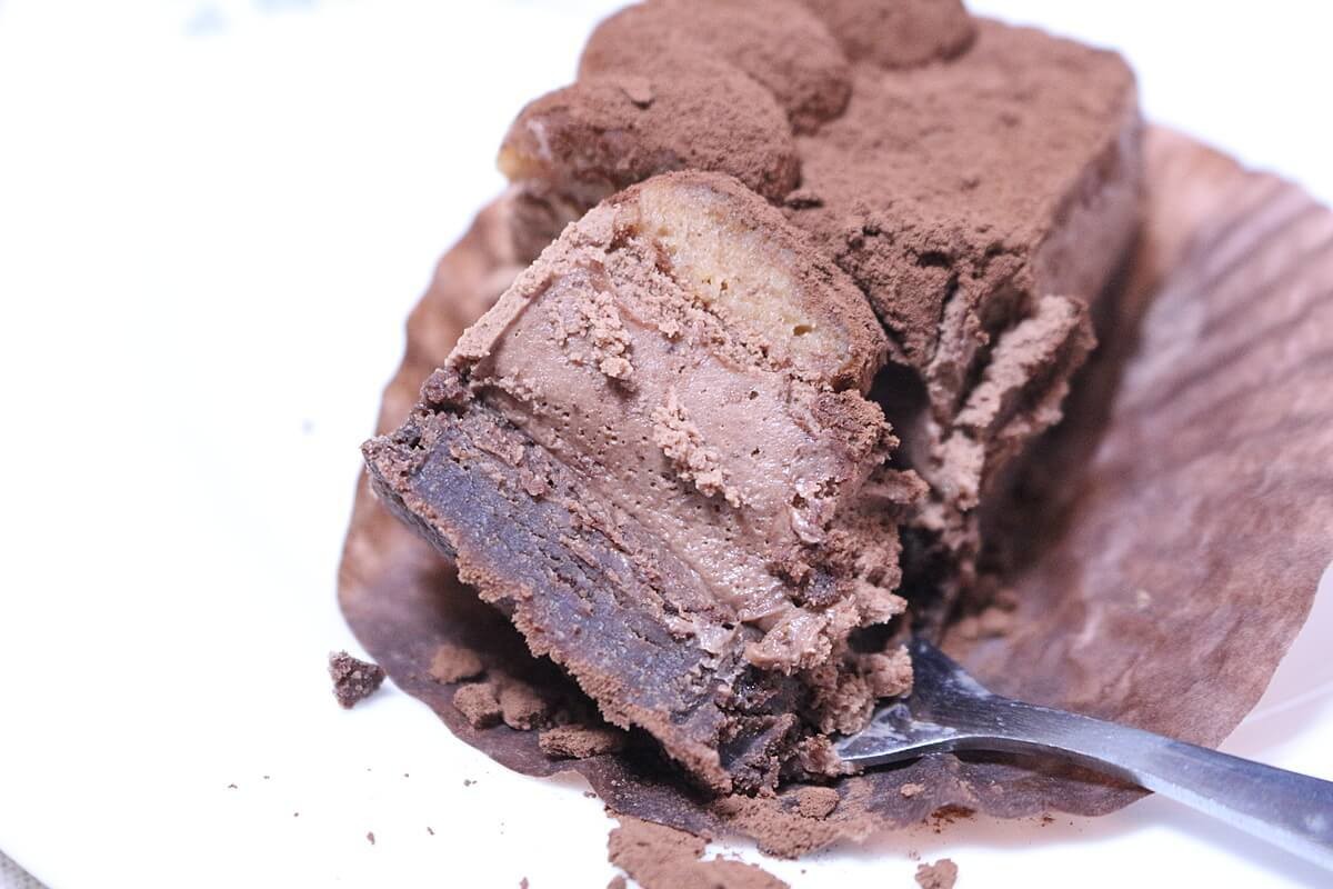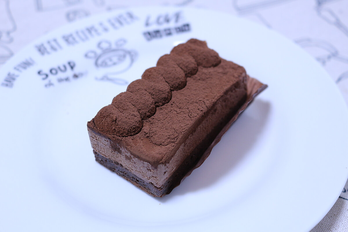 ケーキ全体が食べやすい“しっとりムース系”かと思いきや……底には小ぶりケーキながらも存在感がありすぎる、かた~いチョコレート生地が広がっています!!