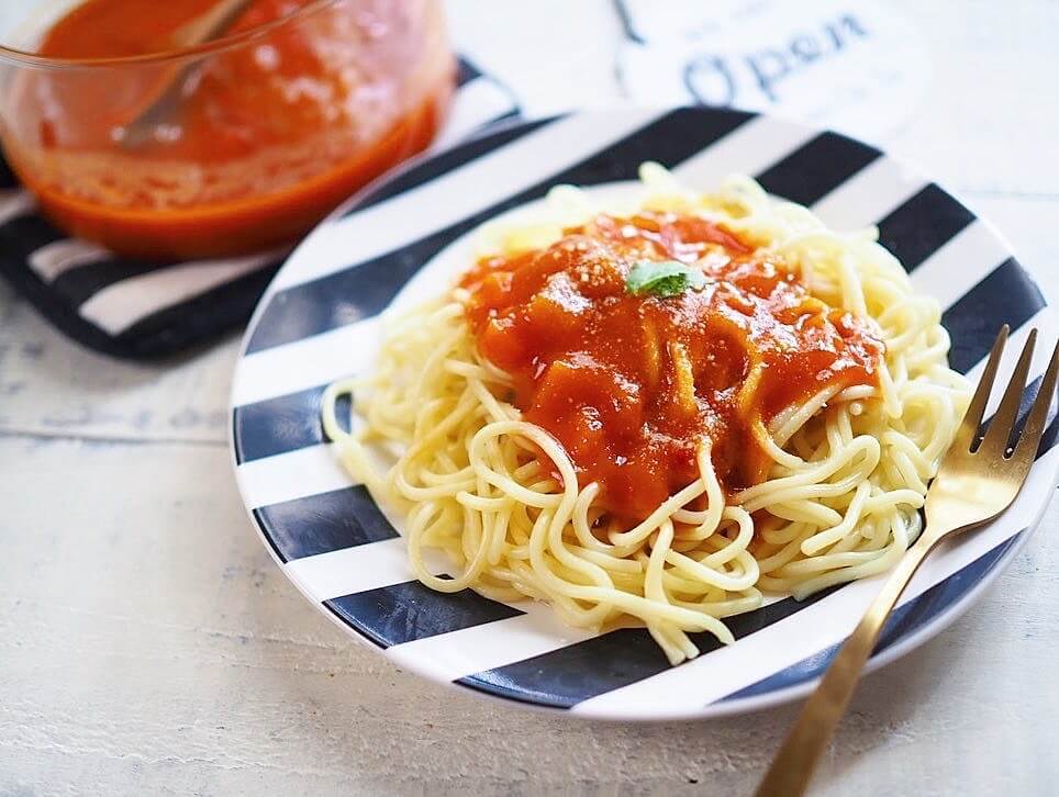業務スーパーのレトルトパスタソースを使えばかけるだけなので、さらにお手軽で究極の時短&ズボラメニューです!