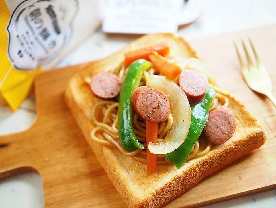 焼いたトーストに、焼そばをのせるだけで「焼そばパン」ならぬ「焼そばトースト」が完成です!
