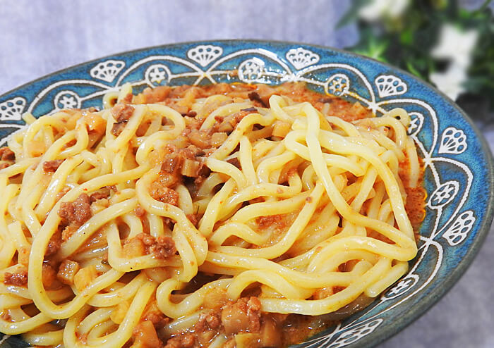 上で紹介した無印良品「胡麻味噌担々スープ」とは対照的に、ジャージャーソースはどろっとしていました。ソースはかなり甘めに仕上がっていて、予想通り子ども達が気に入ってバクバクと食べてましたよ。