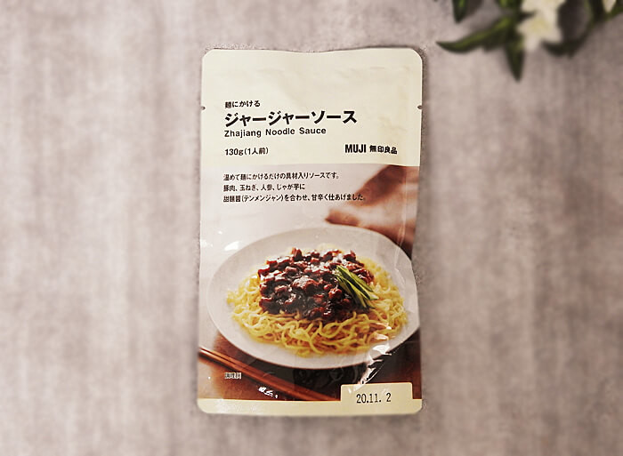 無印良品「ジャージャーソース」は、甜麺醤で仕上げた甘いソース。子ども用に購入しました。豚肉、玉ねぎ、人参、じゃがいもが入っていて、歯ごたえもありそうです。