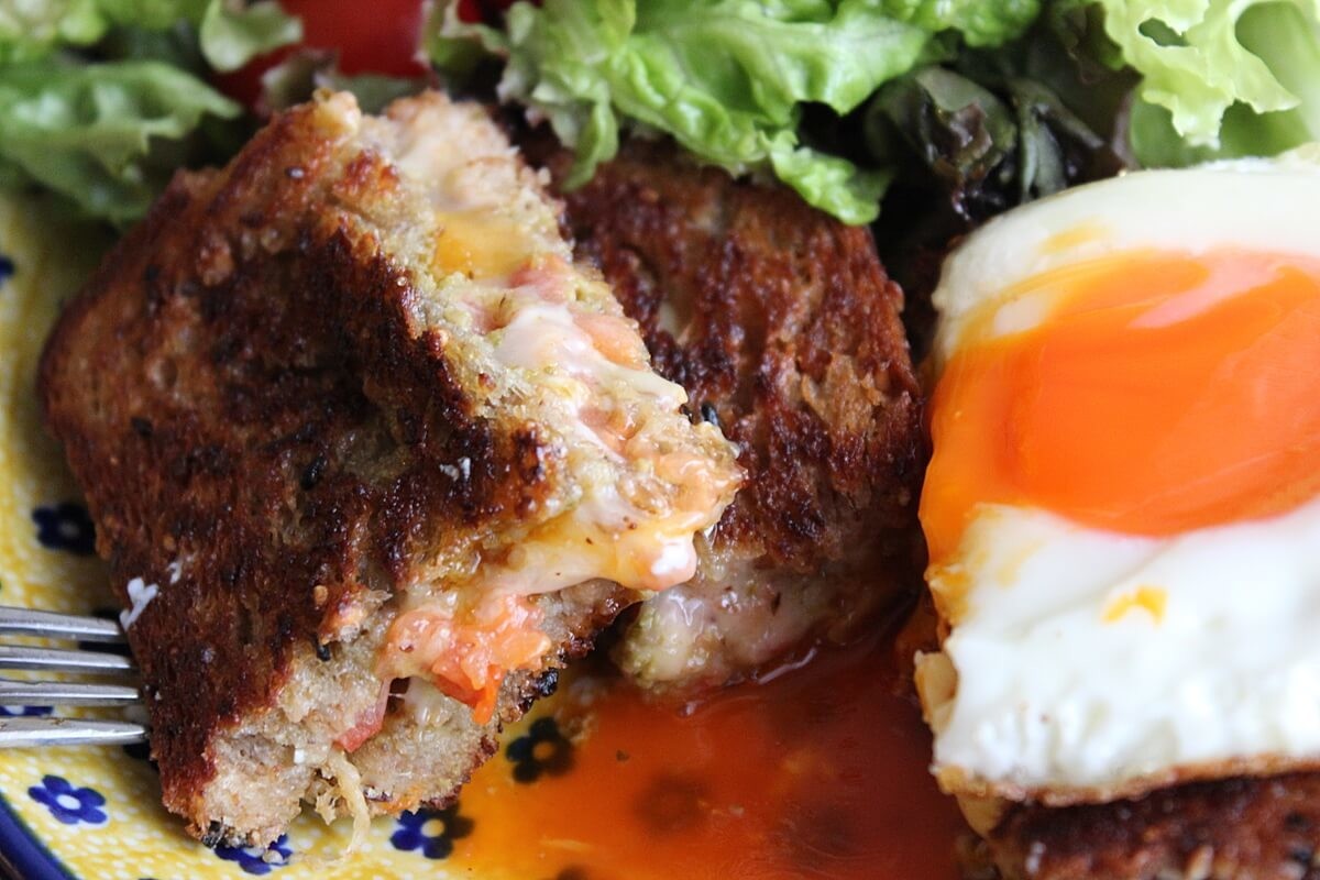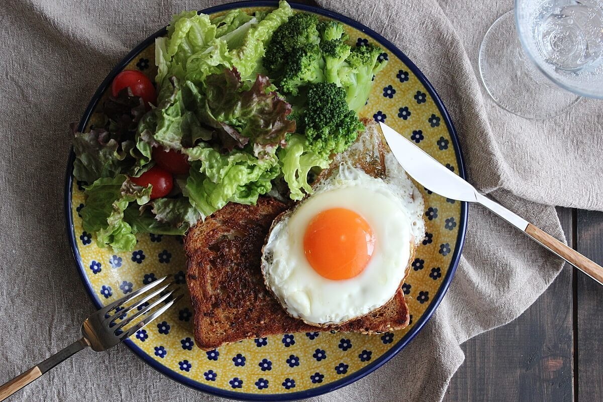 パンを重ねてこんがりと焼き、目玉焼き、サラダとともに盛り付ければ出来上がりです!