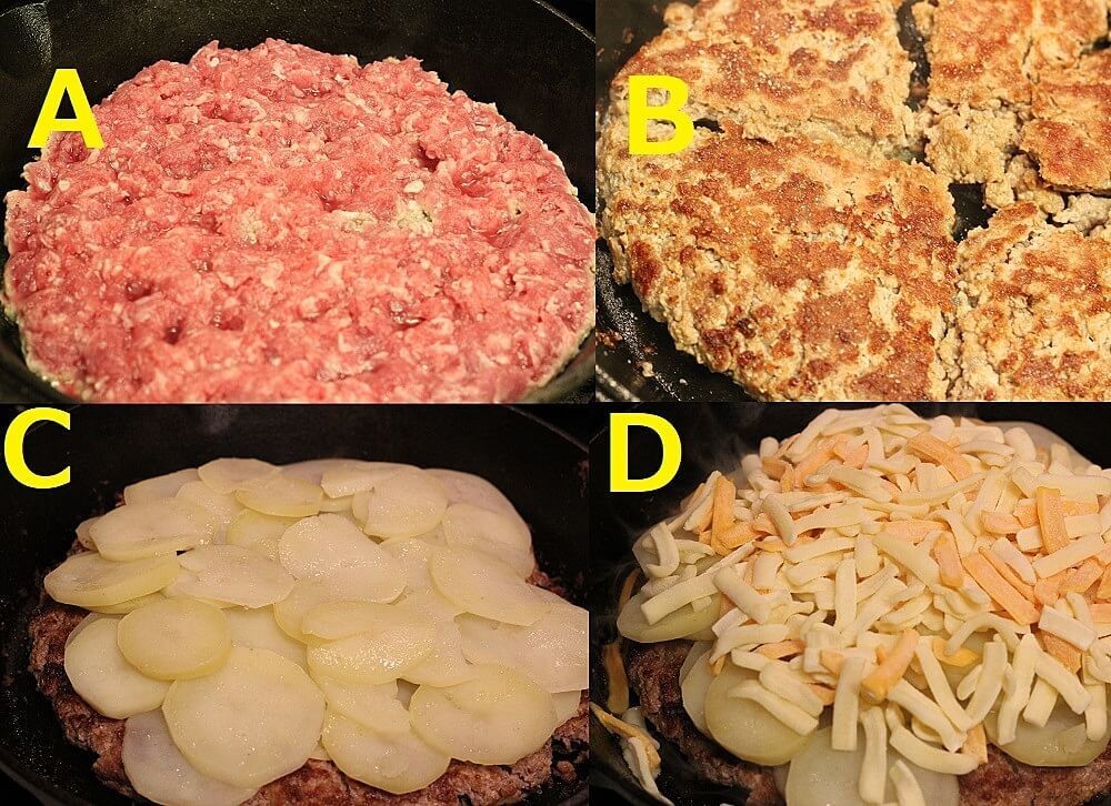 - 写真A:フライパンに豚ひき肉を全量、丸く、そして厚みが大体均等になるように入れ、塩、こしょうをしっかり目にし、カレーパウダー小さじ1を全体に均等にふりかける。