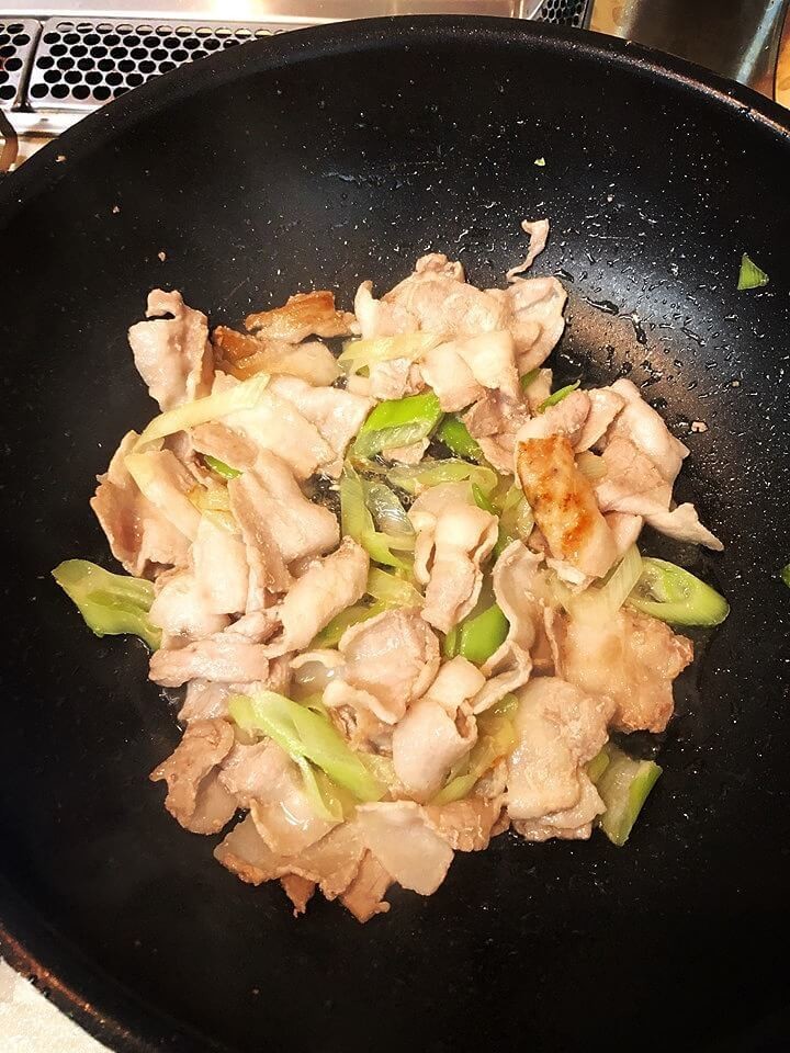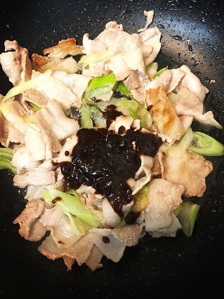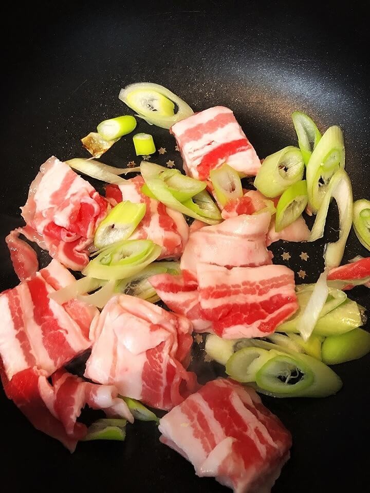 (2)同じフライパンに豚バラ肉と長ネギを入れて中火で炒め、火が通ったら、弱火にして液体調味料を加えて絡めます。