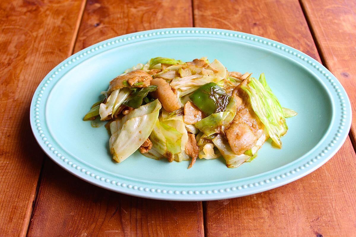 (1)熱したフライパンに油大さじ1(分量外)をひき、キャベツとピーマンを強火で炒めます。